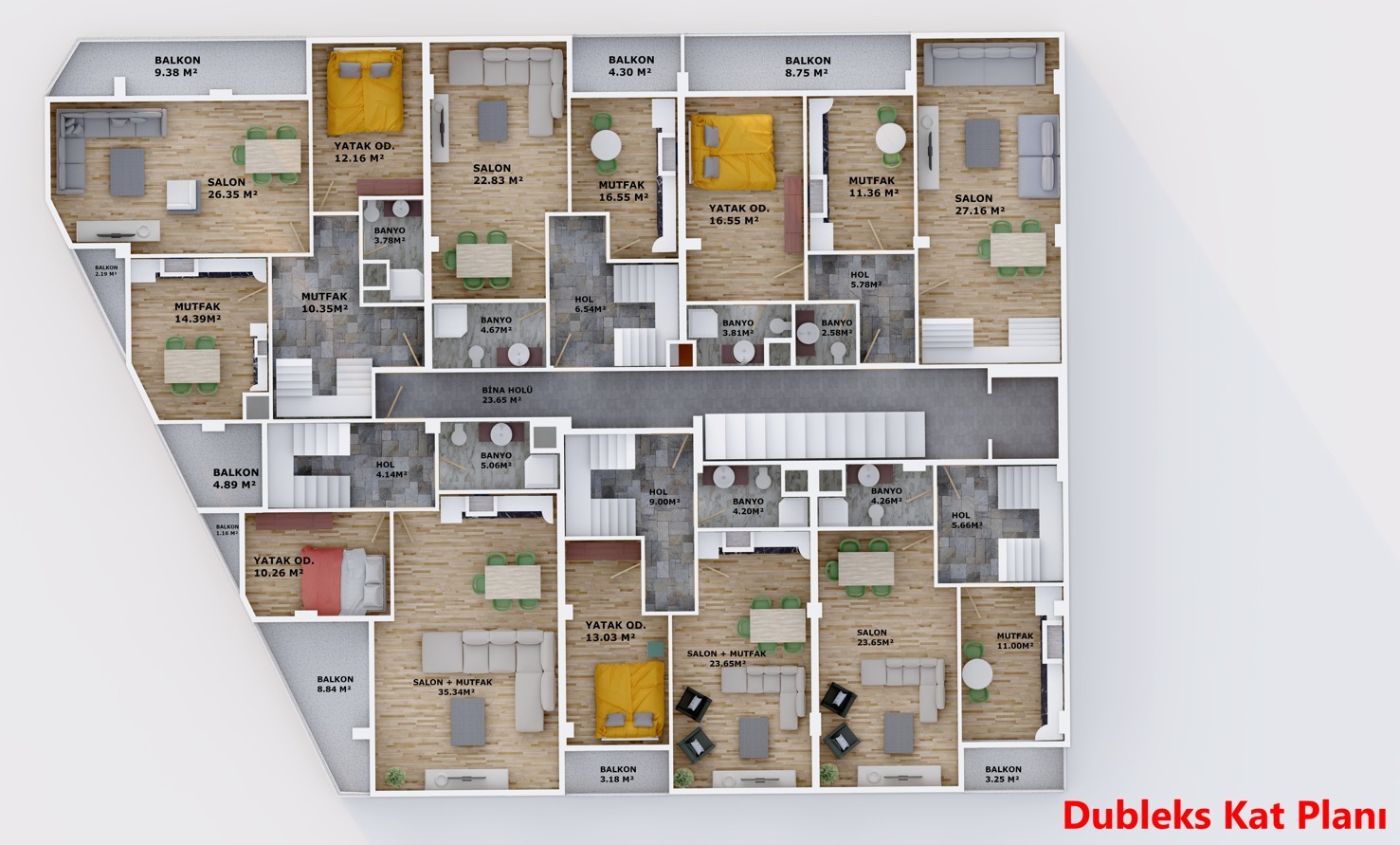 Geniş ve kullanışlı daire planları, modern tasarım anlayışıyla birleşerek her detayıyla yaşam kalitenizi yükseltmek üzere tasarlandı. Dubleks dairelerde sunulan ekstra alanlar ise aile yaşamına özgürlük ve konfor katıyor.